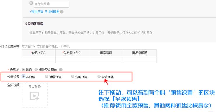 4、如果某些賣家只有部分SKU需要預(yù)售,部分現(xiàn)貨銷售。也必須使用預(yù)售工具來(lái)設(shè)置。(這點(diǎn)已經(jīng)咨詢過(guò)淘寶小二,他們說(shuō)不用預(yù)售工具的預(yù)售商品,一經(jīng)發(fā)現(xiàn),將會(huì)被直接刪除寶貝),設(shè)置時(shí),可在SKU上注明哪些寶貝是需要預(yù)售的,哪些是現(xiàn)貨。但需要注意的是,SKU上的價(jià)格不可高于預(yù)售工具的預(yù)售時(shí)長(zhǎng)