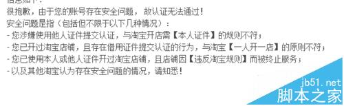 安全問題是指(包括但不限于以下幾種情況): - 您涉嫌使用他人證件提交認證,與淘寶開店需【本人證件】的規則不符; - 您已開過淘寶店鋪,且存在借用證件提交認證的行為,與淘寶【一人開一店】的原則不符; - 您已使用本人或他人證件開過淘寶店鋪,且店鋪因【違反淘寶規則】而被終止服務; - 以及其他淘寶認為存在安全問題的情況,請知悉!