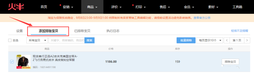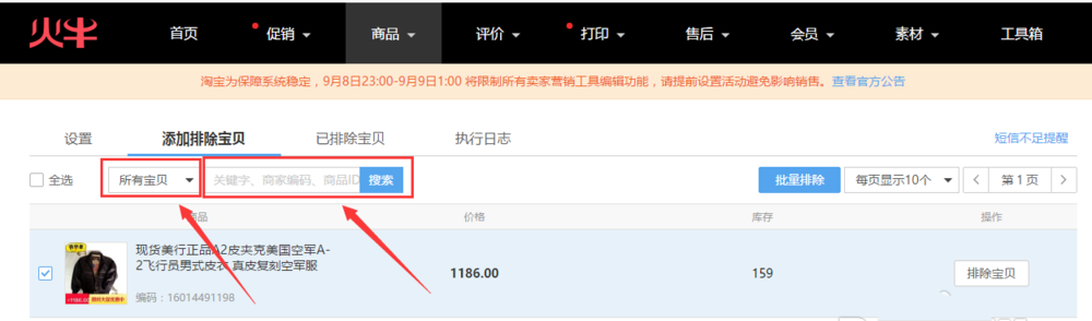 5、如果個別商品不需要參與自動補庫存設置,可以在設置頁面點擊【添加排除寶貝】標簽,通過寶貝分類或者關鍵字,商家編碼,商品ID等方法快速找到不需要自動補庫存的商品。