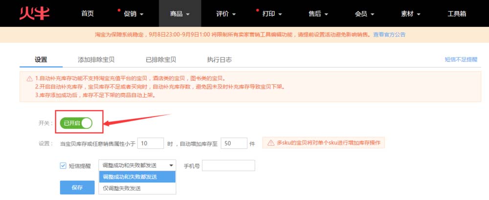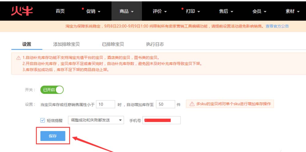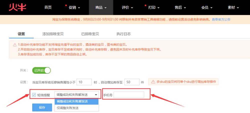 4、為了及時了解庫存調整情況,可以設置短信提醒,在設置頁面勾選【短信提醒】,選擇短信提醒條件,并輸入接收提醒的手機號碼;檢車設置的信息是否正確,確認無誤后,點擊頁面的【保存】按鈕即可設置完成。