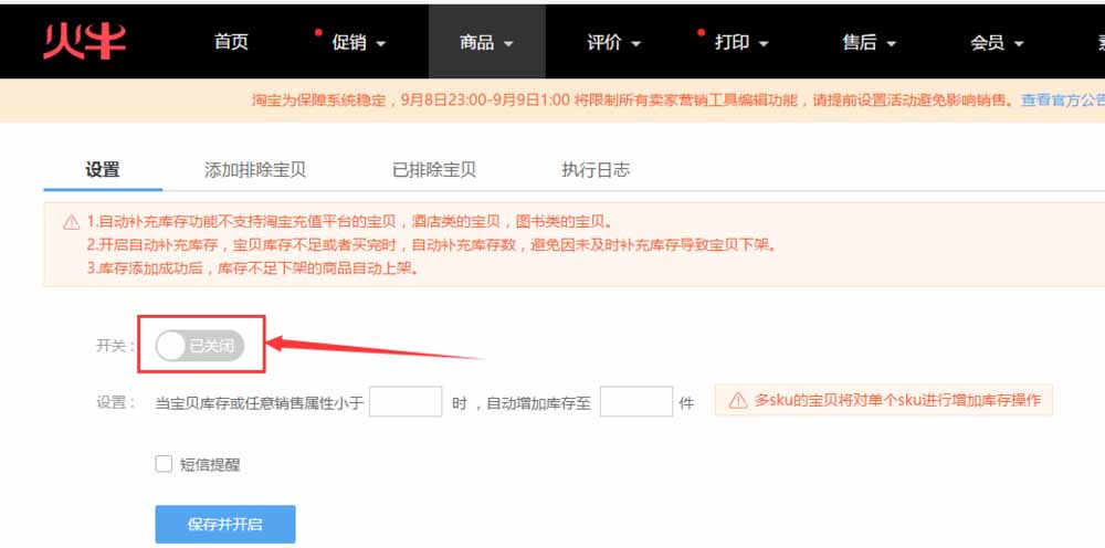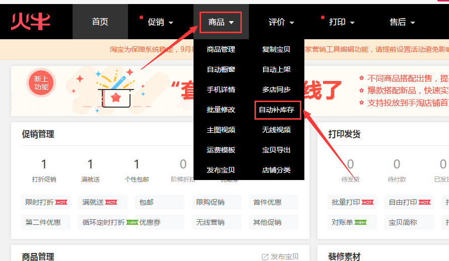2、在火牛首頁導航欄【商品】選項中找到【自動補庫存】,點擊進入自動補庫存設置頁面。