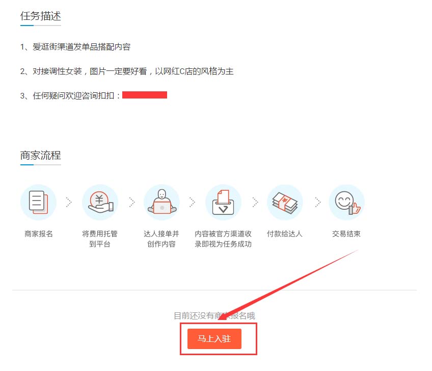 7、選擇滿意的達人活動,在活動頁面最下方點擊【馬上入住】按鈕即可。也可以添加達人的聯系方式,隨時與合作的達人保持聯系。