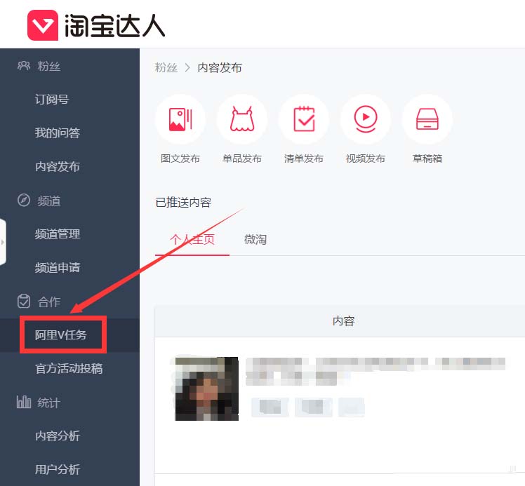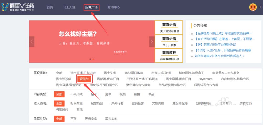 5、也可以在淘寶達人官網的【阿里V任務】中發布或者聯系有能力的達人,幫忙推廣。點擊【阿里V任務】后,進入【招商廣場】。