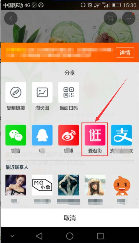 2、會彈出一個分享對話框,可以選擇分享的對象,在該對話框選擇【愛逛街】選項。