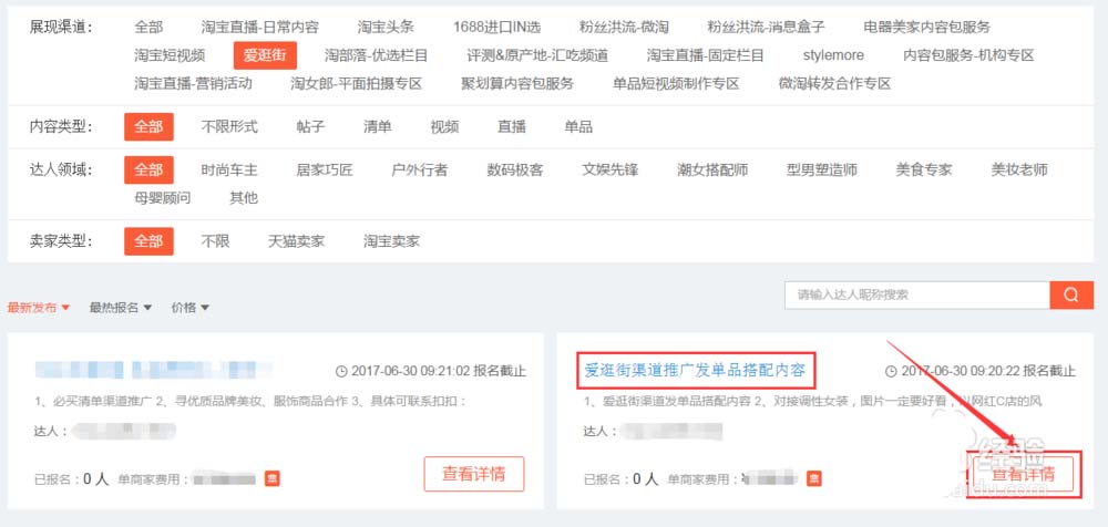 6、在【招商廣場】通過系統推薦的渠道篩選可以做【愛逛街】的達人。一般和達人合作是有一定費用的,根據自己的承受能力選擇合適的達人合作。篩選到合適的達人可以點擊【查看詳情】按鈕,詳細了解合作事項。