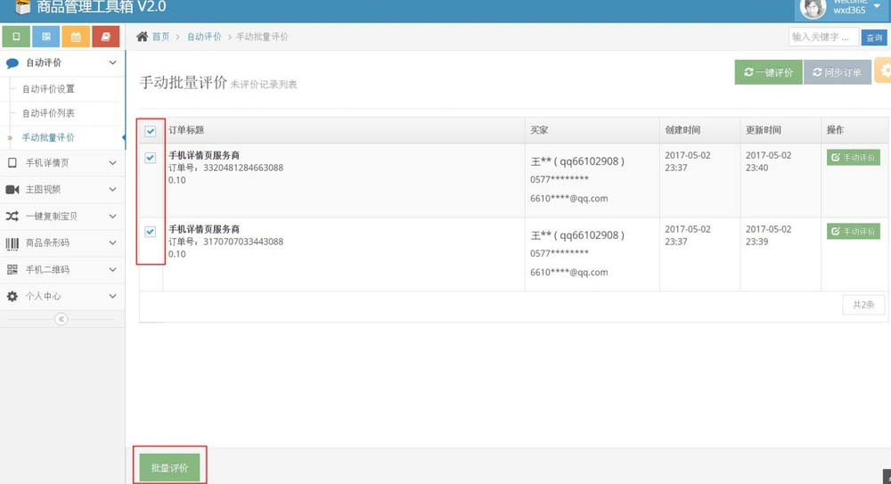 6、您還可以手工批量對未評價的訂單進行批量評價