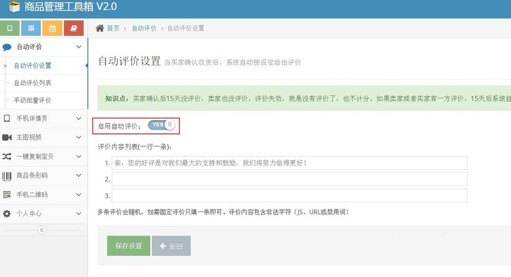 4、點擊開啟自動評價總開關(guān),設(shè)置默認的評價內(nèi)容,開啟后,當(dāng)前新訂單完成時,即會自動對該訂單進行自動評價,無需要開任何軟件窗口。