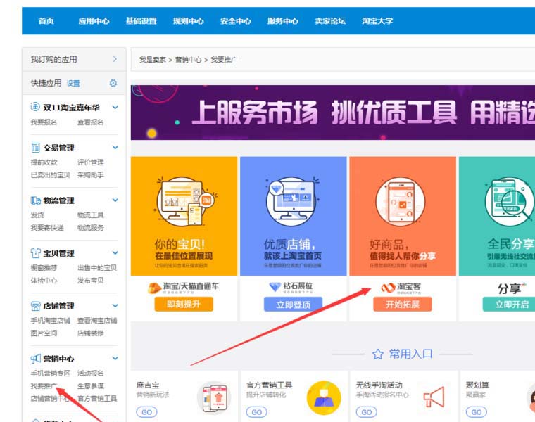 2、登陸淘寶賣家賬號,進入賣家中心-營銷中心-我要推廣-開通淘寶客