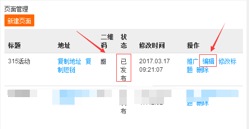 6、進入店鋪活動頁面以后,我們找到上一個已經(jīng)發(fā)布的活動頁面,點擊后面的“編輯”進入活動編輯頁面。
