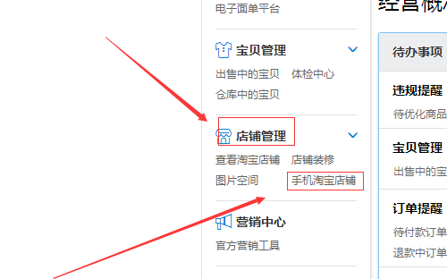 3、進入“賣家中心”以后,我們找到“店鋪管理”里面的“手機淘寶店鋪”并點擊進去。