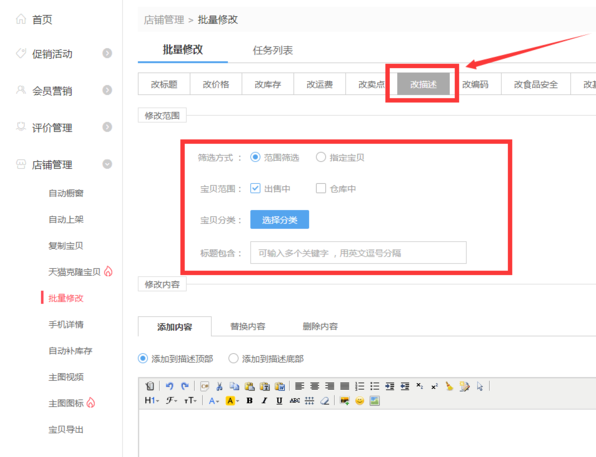 2、點擊批量修改里面的“改描述”,然后選擇需要設置的寶貝。