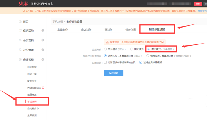 在寶貝詳情頁批量插入春節公告后,進入火牛軟件里店鋪管理模塊的“手機詳情”功能設置。進入后點擊上方的“制作參數設置”選擇圖文模式,重新生成下手機詳情即可。
