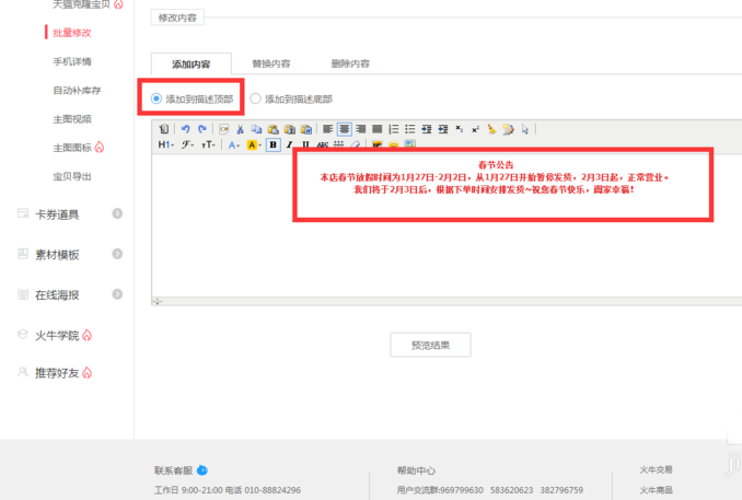 設置店鋪公告,其實就是在寶貝詳情頁和店鋪首頁插入假期公告安排。如果不想作圖的話,可以直接用文字的形式將店鋪放假公告編輯到寶貝詳情頁里,店鋪首頁的放假公告直接在裝修店鋪里設置即可。