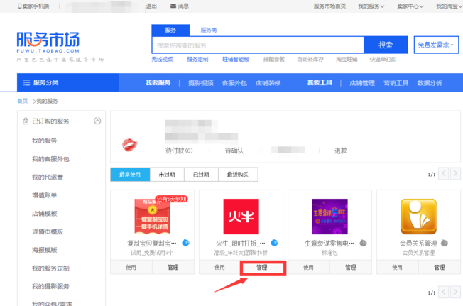 1、首先登陸淘寶賣家后臺,點擊屏幕左側的“我訂購的應用”-“管理我的訂購”進入軟件管理中心。