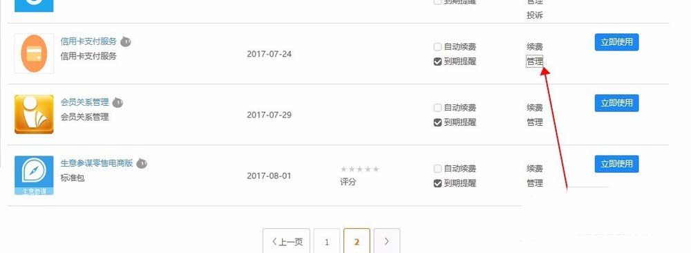 3、在所以我們開通的服務中找到,我們想要取消的信用卡支付功能,如圖所示,點擊這個功能后方的管理按鈕。