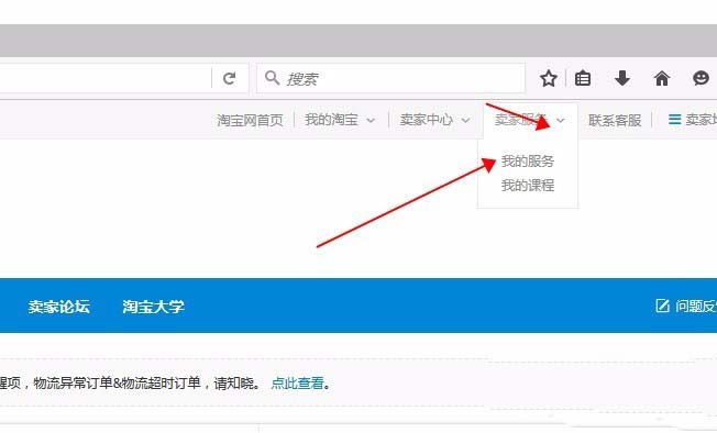 1、登陸淘寶,進入到賣家中心,點擊右上方的賣家服務---我的服務子命令,如圖所示。