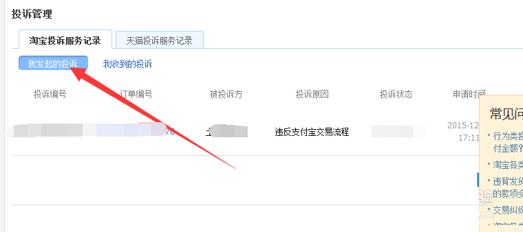 6、點(diǎn)擊投訴管理后,進(jìn)入相應(yīng)的界面如下圖所示,可以看到投訴的編號(hào),投訴的時(shí)間,以及處理的結(jié)果,你所有的投訴記錄都會(huì)反饋在這里。接下來(lái)就完成了。