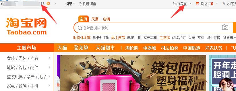 3、登入后,進(jìn)入淘寶首頁(yè)界面后,點(diǎn)擊我的淘寶或者自己的id,都可以進(jìn)入我的淘寶頁(yè)面