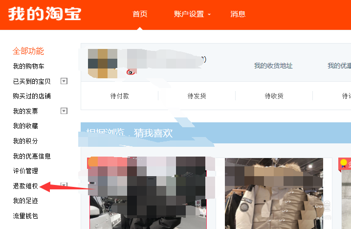 4、接下來(lái)就到了我的淘寶頁(yè)面,如下圖所展示,點(diǎn)擊全部功能下的退款維權(quán)按鍵。會(huì)出現(xiàn)幾個(gè)子菜單欄