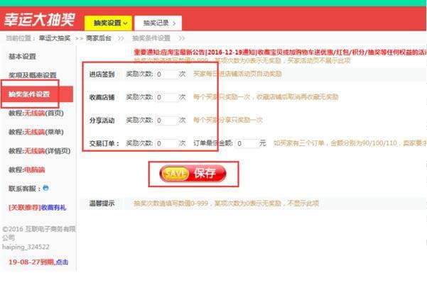 14、點擊左側的“抽獎條件設置”,在右側設置獎勵次數,點擊“保存”按鈕,此時設置完畢