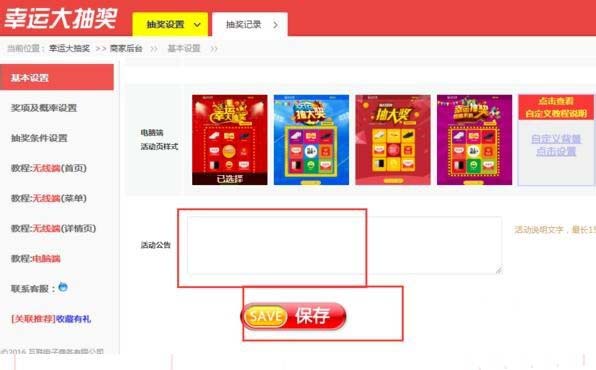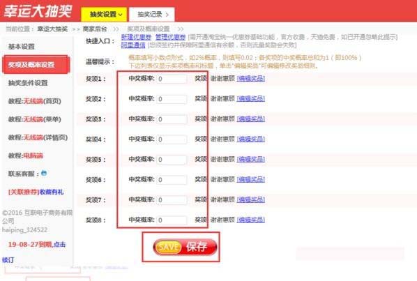 13、點擊“獎項和概率設置”,然后在右側設置中獎概率,點擊“保存”