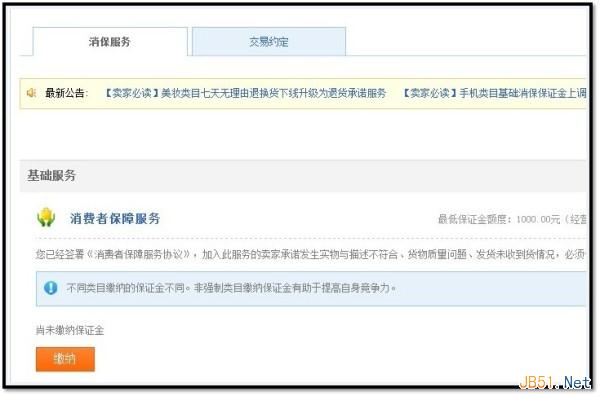 第二步:繳納消費者保證金(交錢和簽協議都是同一個入口,目前保證金繳納的最低配置是1000, 大部分類目都是需要繳納才能發布全新寶貝,不繳納就只能發布閑置/二手商品。) 繳納保證金入口:“賣家中心”—“客戶服務”—“消費者保障服務”