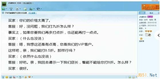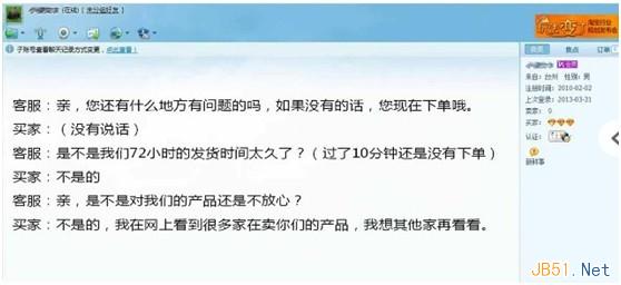 2、我想貨比三家 不管客戶是真的拒絕還是假的拒絕,客戶不可能馬上就改變主意。如果客服指導(dǎo)競爭對手價格更高,也不能馬上告訴買家,讓買家匆忙做出決定。因為這樣如果后續(xù)商品有問題,買家會認(rèn)為是我們逼迫下買的,會把責(zé)任推向客服。而且買家有可能只是短暫離開,如果我們還是纏著不放,會讓買家產(chǎn)生抵觸心理。我們一定要和買家保持良好的關(guān)系,即使這次做不成生意,但也許下次他會主動找到你。我們再來看一個案例: