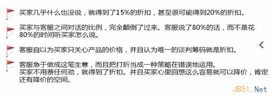 這里客服沒有觀察到買家真正的心里狀態(tài),買家已經(jīng)鐵了心決定不買了,但客服還是想改變買家的想法,這樣做其實是不對的。買家這次不購買,不意味著下次不購買,如果一味糾纏,嚴(yán)重影響買家下次來購買的幾率。當(dāng)買家以這種方式拒絕時,千萬不要企圖改變他們的主意,這種方法不會奏效,只會讓談話變得很不愉快。那我們該怎么辦呢?有價值的撤退!客服需要能夠讀懂買家的信號,當(dāng)買家做出這個決定時,需要尊重他的決定。可以對買家說:好的親,這由您決定。但當(dāng)您下次需要的時候,您可以再來找我們哦。我們會給您最大的優(yōu)惠。這里講到的撤退不是放棄,而是從長久利益看:當(dāng)買家這次不買的時候,不意味著永久不買,留住最好的好印象是十分關(guān)鍵的。