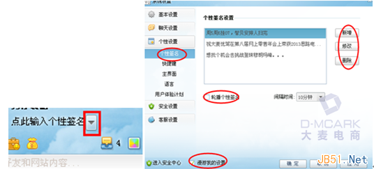 A.內容:個性簽名是傳播給客戶的首條信息,所以內容很重要,必須給客戶留下深刻的印象。一般可以宣傳店鋪現有活動,預告店鋪參加的活動等。例如:“親,本店于5月20號舉辦優惠活動,滿49全店包郵,先搶先得!”內容簡潔、清晰,讓客戶第一時間了解到您店鋪的信息,也可以為接下來的談單做鋪墊。