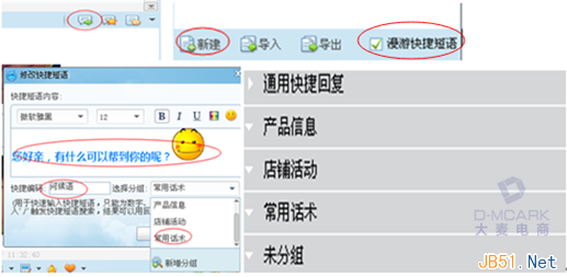 A. 分組:一般店鋪的快捷用語可以分為以下幾組,通用快捷用語(快遞,發貨時間,退換貨時間等),產品信息(熱賣寶貝的產品介紹),店鋪活動(店鋪活動內容),常用話術(問候語,歡送語等)