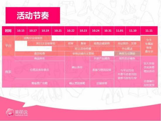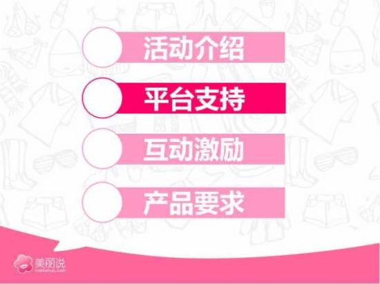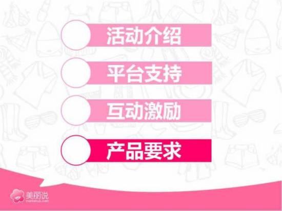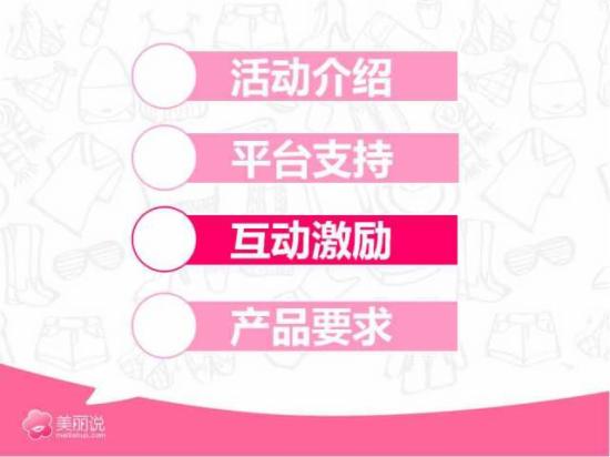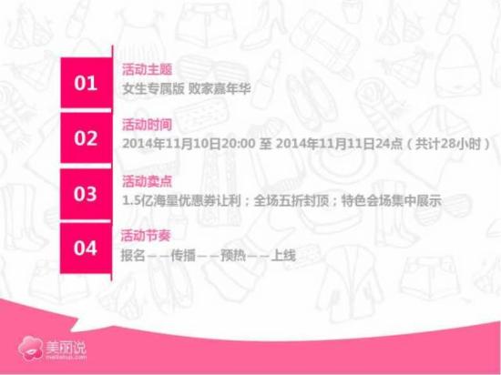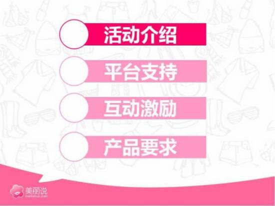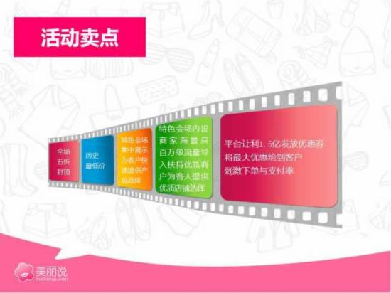 一、1個主題5個專場力推特色商家,本次美麗說雙十一大促以“女生專屬版敗家嘉年華”為主題,并細分為“衣服館、美鞋館、箱包館、日化美妝館、女生特別館”五大特色會場,主打女生時尚牌。