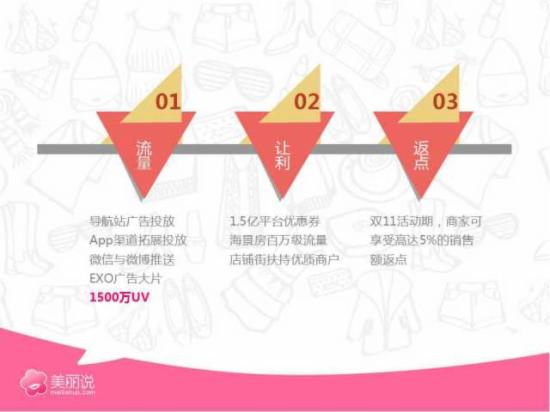 四、1500萬UV、最高5%高額返點,最大力度流量導入(導航站+APP+微博+微信+手Q)高達1500萬UV;活動期間商家可獲得最高5%銷售額返點及APP內(nèi)優(yōu)質(zhì)廣告位。