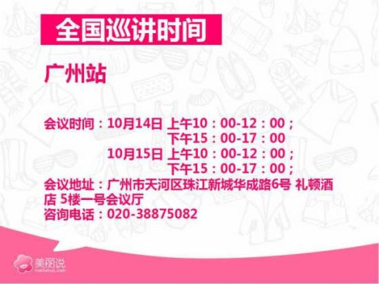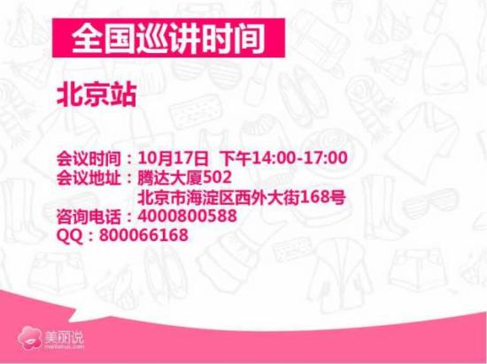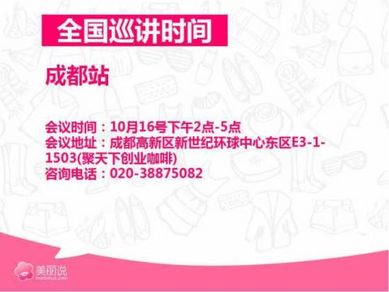 五、5大城市政策宣講,北京、廣州、杭州、武漢、成都五大城市線下宣講,為地區(qū)商家全面解讀美麗說雙十一激勵政策,力保商家出色應對。