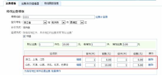 但其實,賣家不必如此大費周章地解釋,現在的運費模板已經可以分區域設置包郵。例如親的寶貝只支持江浙滬包郵的,即可以單獨勾選江浙滬是0運費,而其他地方則是正常的運費,在選擇時也非常清晰。如果你還不知道這個功能,就可以馬上動手試一試。具體設置如下圖: