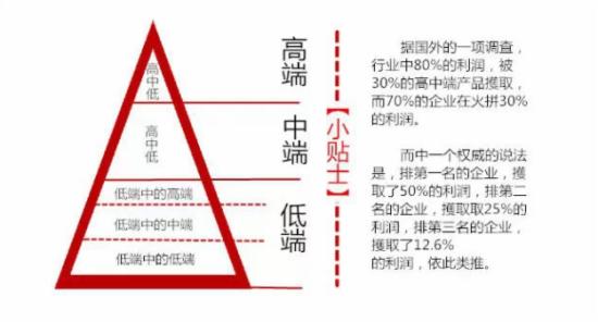 有一個權威的說法,每一個行業,第一名的企業占據了50%的利潤,第二名只有第一名的一半,即25%的利潤,以下每一名依此類推。那么依據這個規律,我們根據自己的實力,可以選擇高中低端來細分市場,還可以選擇高中低端的高中端來細分市場,從而據此定價。