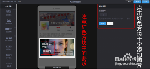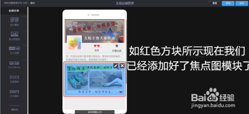 放開鼠標左鍵后出現(xiàn)如下圖所示的頁面,焦點圖模塊已經添加到無線店鋪里面了,接下來的操作就該添加焦點圖模塊展示時所需的圖片和鏈接地址了。然后點擊最右上面的十字按鈕就可以添加焦點圖模塊所需的圖片了。