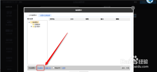 點擊上傳新圖片按鈕后,出現(xiàn)如下圖所示的頁面。然后點擊下圖中紅色箭頭所指的地方添加圖片,點擊添加圖片按鈕。