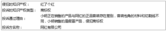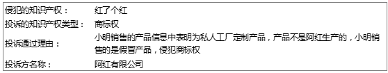 曉明針對該投訴未提交申訴材料,所以,曉明被阿紅的“紅了個紅”商標(biāo)權(quán)投訴售假成立,售假的次數(shù)記錄1次。