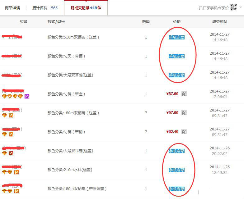 5、好好利用并設(shè)置手機(jī)專享價(jià),只要賣家設(shè)置了手機(jī)專享價(jià),那么就算價(jià)格差距多大,在PC端的銷售記錄中都不會(huì)顯示客戶拍下的具體價(jià)格,這就有效保護(hù)了手機(jī)專享價(jià)的特權(quán)。
