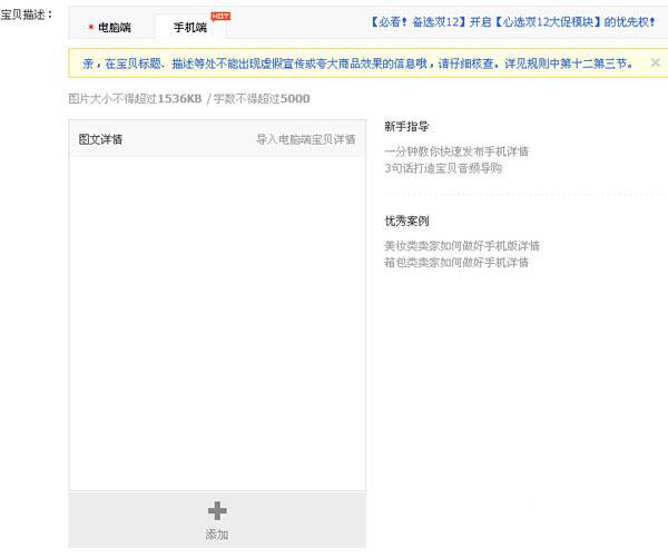 1、內(nèi)容一定要精簡(jiǎn)明了。要突出重點(diǎn)。要嚴(yán)格按照規(guī)范上傳手機(jī)版的寶貝詳情,單個(gè)寶貝描述總圖片大小不得超過1.5MB(包含1.5MB),同時(shí)要重點(diǎn)突出賣點(diǎn),有效優(yōu)化打開的速度與降低流量損耗。