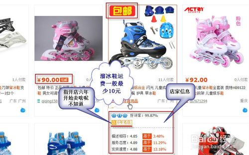 5、在店鋪名稱的地方,光標會顯示出相關信息,比如店齡、好評率等等。幾年老店不代表這種商品賣了幾年了啊,只能說明店開了幾年了,至于這些年都是什么店,這里看不出來,因為淘寶店是可以改商品的。不要以為這是賣溜冰鞋6年老店,還有可能這個店是賣土產的,這幾天替朋友賣溜冰鞋呢。所以,下一步就是要進去看評價了!