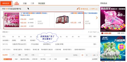 1、打開淘寶輸入你想要買的東西,置頂的都是投放廣告了的。
