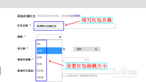 4、填寫店鋪紅包的名稱,點(diǎn)擊面值、選擇紅包面值的金額大小,最低5元、最高200元。