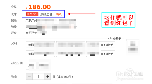 9、好了以上都設(shè)置好后打開你的寶貝,在價(jià)格下方看看是不是已經(jīng)多出了一個(gè)紅包標(biāo)簽?zāi)兀?/p>