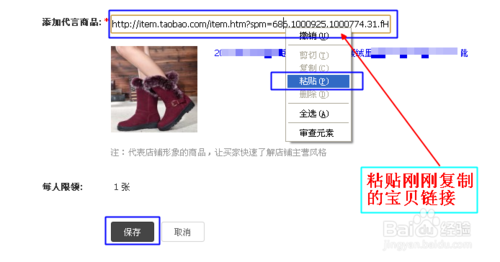 7、將剛剛復(fù)制好的寶貝鏈接,粘貼到 添加代言商品的框里面。在點(diǎn)擊保存。