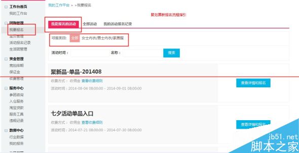 第一步:首先是進入聚劃算平臺——找到“我的工作臺”,并且點擊“我要報名”,通過列表中選擇“我能報名的活動”,查看符合你店鋪經營類目的活動列表;