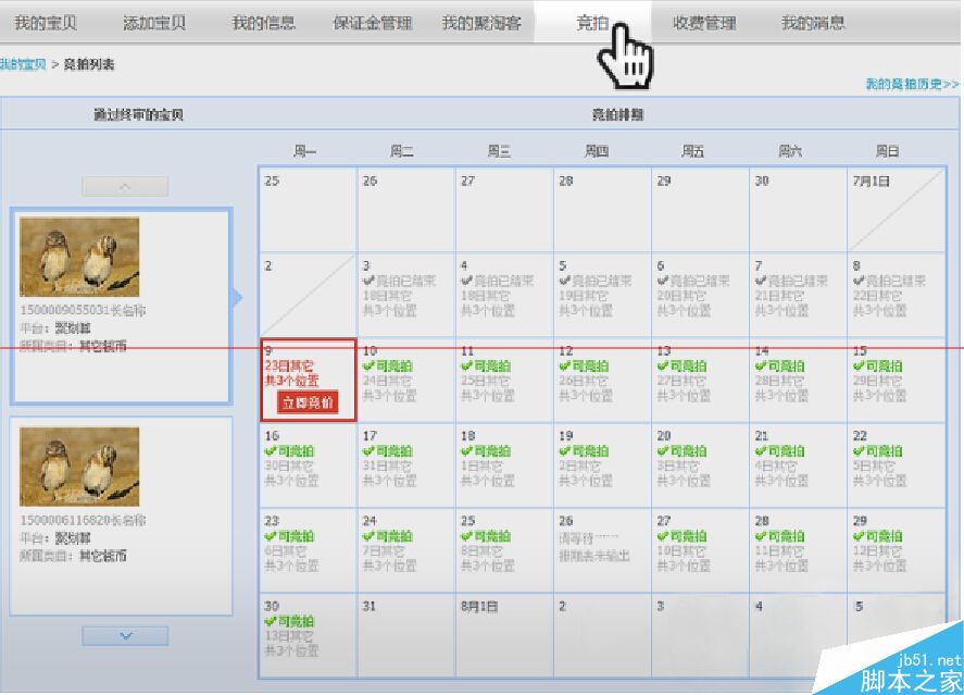 a、首先登陸進入自己的聚劃算后臺,點擊“競拍”之后出現競拍日歷(在商品通過審核的第二天)