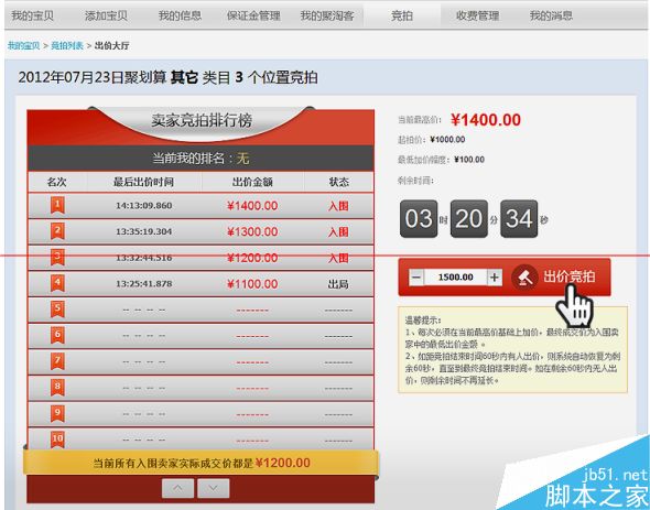 d、競拍開始之后,要在設置你的競價金額之后點擊出價競拍,排行榜中會有狀態提示“入圍”和“出局”