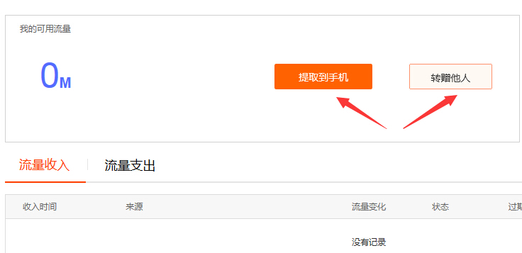 5.由于沒有流量不可以操作贈送和提取這兩個動作。所以只得看著。贈送不可以直接送到手機中去,而是送到去對方的流量錢包中去的。