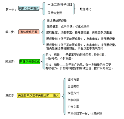 做好了引流,就需要談論點擊率,點擊率公式為:點擊率=點擊量/展現量。怎樣優化點擊率,從公式可以看出,一是增加點擊量,二是減少不必要的展現,下面一張圖簡單的概括了點擊率優化的流程: